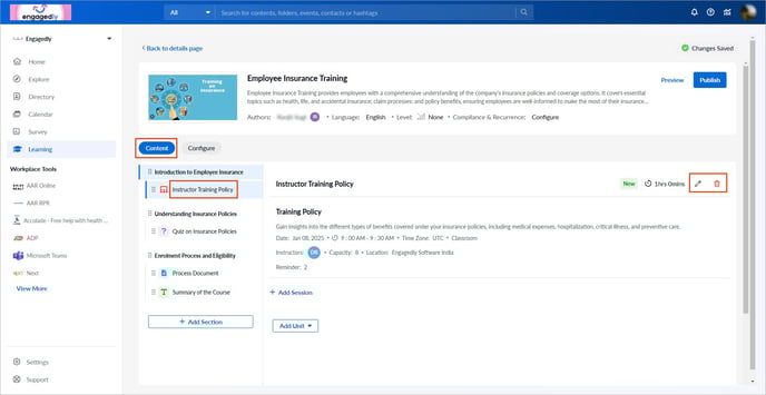 - In the Content tab, select an instructor training unit on the left.
